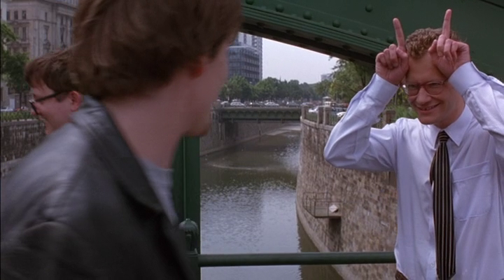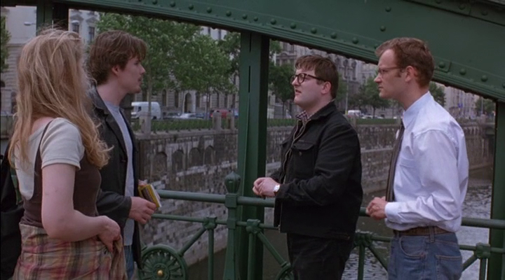 In Before Sunrise, immediately after the initial awkwardness of their official presence in Vienna on the Zollamtssteg bridge, the couple encounters two amateur actors and promise going to their play in the evening. It’s an absurd play about Indians searching for a cow that (1) has a disease, (2) acts like a dog, (3) smokes with her hoofs. This cow seems to symbolize both sanctity and its profanation, as well as the breast as the initial object of desire. It is quite significant that Jesse asks whether the cow is real, and one of the actors says: The cow is not real, he plays the cow, he is the cow. Actually, the cow here is meant to take the place of the woman who does not exist symbolically. One should note that both actors are male, they both have spectacles, and they are portrayed like weird geeks. Jesse and Celine do not dare turn down the invitation to the play and they promise to meet the actors in the evening.